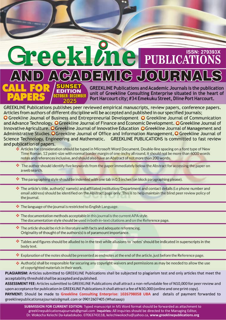 CALL FOR PAPERS! CALL FOR PAPERS!! CALL FOR PAPERS!!! GREEKLINE Publications and Academic Journals is currently receiving papers to publish in our Sunset Edition/October - December, 2025 (Online & Print). Articles from authors of different disciplines will be accepted and published in our specialized peer review journals; * Greekline Journal of Innovative Agriculture. * Greekline Journal of Business and Entrepreneurial Development. * Greekline Journal of Management and Administrative Studies. * Greekline Journal of Finance and Economic Development. * Greekline Journal of Communication and Advance Technology. * Greekline Journal of Office and Information Management. * Greekline Journal of Innovative Education * Greekline Journal of Science Technology Engineering and Mathematics. Authors are required to send in their papers to addressgreeklinepublicationsajournals@gmail.com and attache evidence of payment of N10,000 for paper review and N30,000 for publishing (Online + 1 Print copy). Total payment of N40,000 should be made to Greekline Consulting Enterprise, 1026798058, UBA. Note that extra copy attracts N10,000. Evidence of payment should be forwarded to greeklinepublicationsajournals@gmail.com, 09012607405, 07063743118. .